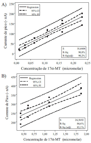 ![]() Figura 6. Curvas analíticas de padrão externo do hormônio 17α-MT sobre HMDE em baixas concentrações, 1,0×10-8 a 2,31×10-7 mol L-1, (curva A) e em altas concentrações 4,18×10‑7 a 1,87×10-6 mol L-1 (curva B). () Regressão, (- -) Intervalos de confiança (95%) e (---) Intervalos de Predição (95%)