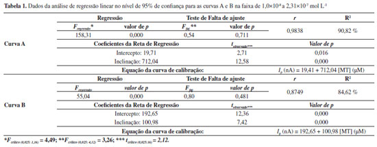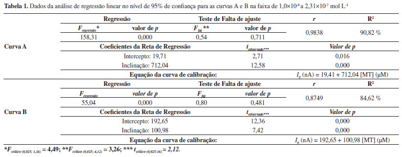 Os resultados da análise de regressão linear para a quantificação do hormônio 17α-MT são apresentados na Tabela 1, em ambas as faixas de concentração investigadas. A curva analítica no intervalo de concentrações de 1,0 × 10-8 a 2,31 × 10-7 mol L-1 (Curva A, Figura 6-A) mostrou-se linear, no nível de 95% de confiança com coeficiente de determinação (R2) de 90,82% e coeficiente de correlação linear (r) de 0,9838 (Tabela 1), indicando que o modelo linear se ajusta bem aos dados experimentais. Estes resultados são ressaltados pelo fato da regressão linear ser significativa (Fregressão > Fcrítico; p < 0,05) e não haver evidências de falta de ajuste do modelo linear (Ffaj < Fcrítico; p > 0,05). Para a curva analítica construída no intervalo de concentrações de 4,18 × 10-7 a 1,87 × 10-6 mol L-1 (Curva B, Figura 6-B) foi observado também um comportamento linear para o nível de confiança de 95%, com coeficiente de determinação (R2) de 84,62% e coeficiente de correlação linear (r) de 0,8749 (Tabela 1) indicando que o modelo linear se ajusta aos dados experimentais. Novamente, foi observado que a regressão linear é significativa (Fregressão > Fcrítico; p < 0,05) e não há evidências de falta de ajuste do modelo linear (Ffaj < Fcrítico; p > 0,05) (Tabela 1). Em vista dos resultados, pode-se sugerir que as duas curvas analíticas apresentam linearidade na faixa de concentrações investigadas. Normalmente, o critério de aceitação utilizado para verificar se o método apresenta linearidade na faixa de concentrações investigada é o coeficiente linear (r),28,30 sendo recomendados valores de r > 0,99. Neste trabalho, foram obtidos valores de r < 0,99 para as duas curvas analíticas. Mas, por outro lado, a análise dos resultados da regressão linear e do teste de falta de ajuste (Tabela 1) demonstrou que ambas apresentam linearidade na faixa de concentrações analisada. Embora amplamente utilizado em estudos de validação, o coeficiente de correlação linear não comprova a linearidade do método analítico investigado como já comprovado na literatura. Araújo33 demonstrou para um método cromatográfico que somente o cálculo do coeficiente linear não é suficiente para determinar a linearidade de um método analítico, pois os valores de r > 0,99 mostraram falta de ajuste do modelo linear após a aplicação da regressão linear simples. As diferenças podem ser explicadas pelo fato do coeficiente de correlação linear descrever apenas o grau de associação entre a resposta eletroanalítica e a concentração da espécie eletroativa, enquanto que a análise de regressão linear permite estabelecer qual o modelo estatístico mais adequado entre estas duas variáveis.30 Um teste-t foi aplicado aos resultados das duas curvas analíticas de 17α-MT para verificar a significância dos coeficientes (intercepto e inclinação) no nível de confiança de 95% (Tabela 1). A análise do teste-t indicou que os coeficientes linear e angular devem ser inseridos no modelo, porque os valores de p são menores do que 0,05 e os valores de tobservado são maiores que o valor de tcrítico. Assim, pode-se sugerir que as duas curvas analíticas não passam pela origem e os interceptos são significativos, portanto as equações devem ser representadas considerando os coeficientes angular e linear (Tabela 1). Comparando-se os coeficientes angulares das curvas de calibração observa-se que a curva A (Figura 6-A) tem uma inclinação sete vezes maior do que a curva B (Figura 6-B). Desta forma, pode-se concluir que a curva A apresenta maior sensibilidade para a determinação do hormônio 17α-MT em água (Tabela 1) e, portanto, foi utilizada na quantificação do mesmo nas amostras de água investigadas neste trabalho. Limites de detecção e de quantificação Como descrito anteriormente, a curva analítica compreendida na faixa de concentrações de 1,0×10-8 a 2,31×10-7 mol L-1 (Curva A, Figura 6-A) apresentou maior sensibilidade e foi utilizada para o cálculo dos limites de detecção (LD) e de quantificação (LQ). Assim, os valores de LD e de LQ para o hormônio 17α-MT pelo método voltamétrico proposto foram de 3,07 µg L-1 (1,02 × 10-8 mol L-1) e 10,78 µg L-1 (3,6 × 10-8 mol L-1), respectivamente, no tempo de pré-concentração de 120 s. Precisão A precisão foi avaliada pelas estimativas de repetitividade e precisão intermediária. A repetitividade foi calculada a partir de cinco medidas consecutivas de corrente de pico para uma adição de 17α-MT de 1,96 × 10-7 mol L-1. A média da corrente de pico entre as medidas foi de 323,72 nA, e um desvio padrão de 9,22 nA. O coeficiente de variação (CV) para a repetitividade foi igual a 2,85%, o qual foi menor do que o máximo recomendado pela AOAC34 (7,2%) na faixa de concentração investigada. A estimativa de precisão intermediária foi calculada com base em análises realizadas em cinco dias consecutivos com corrente de pico média de 283,2 nA e o desvio padrão de 39,92 nA. O coeficiente de variação (CV) para a precisão intermediária foi de 14,10%. Os CVs para as estimativas de repetitividade e precisão intermediária foram considerados adequados pois, de acordo com Ribani et al. (2004),26 para compostos em níveis traço são aceitos CVs de até 20% considerando-se o grau de complexidade da amostra. Portanto, o método voltamétrico apresenta boa precisão para a determinação do 17α-MT em amostras aquosas. Exatidão A exatidão da metodologia voltamétrica foi avaliada por estudos de recuperação, por adição de padrão em amostras de águas. As porcentagens de recuperação do hormônio adicionado em eletrólito puro e em água de tanque de criação de peixes, a partir de curvas de adição de padrão foram de 100,4% e 108,7%, respectivamente. De acordo com a AOAC (2002)34 para comprovar que o método apresenta boa exatidão são recomendadas taxas de recuperação entre 80 a 115%, p