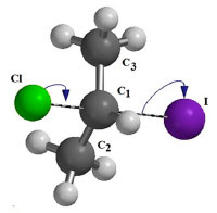 ![]() Figura 1. Geometría propuesta para el estado de transición de las series de reacciones SN2 de la tabla 1. Se muestra para la reacción A3 en la Tabla 1. Las flechas indican el enlace que se forma Cl-C y el enlace que se rompe C-I