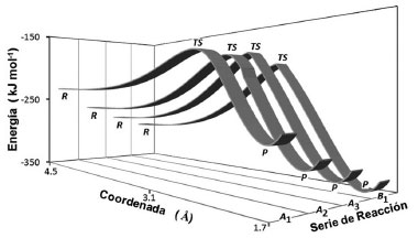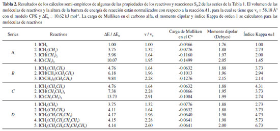 A partir de la geometría optimizada de las moléculas se calculó el momento dipolar, la densidad de carga electrónica de Mulliken del carbono alfa, el volumen molecular con el modelo CPK y adicionalmente se calculó el índice de forma molecular Kappa de orden 1, 1κ. A partir de la simulación de los perfiles de energía de reacción se calculó la altura de la barrera de energía para cada una de las reacciones de la Tabla 1. Los valores de la barrera de energía y volumen molecular se normalizaron con respecto a la reacción A1 para hacer más notorio el cambio en estos parámetros al ir incrementando progresivamente la densidad de átomos alrededor del centro de reacción. Los resultados obtenidos se muestran en la Tabla 2.