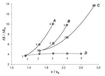 ![]() Figura 3. Correlación entre el cambio en la barrera de energía de reacción y el cambio en el volumen de las moléculas de reactivos. Las curvas A, B, C, D y los números sobre estas son para identificar cada una de las reacciones de la Tabla 1