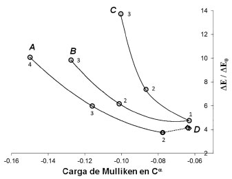 ![]() Figura 4. Correlación entre el cambio en la barrera de energía de reacción y la magnitud de la carga de Mulliken del Cα. Las curvas A, B, C, D y los números sobre estas son para identificar cada una de las reacciones de la Tabla 1