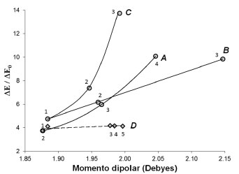 ![]() Figura 5. Correlación entre el cambio en la barrera de energía de reacción y la magnitud del momento dipolar de las moléculas de reactivos. Las curvas A, B, C, D y los números sobre estas son para identificar cada una de las reacciones de la Tabla 1