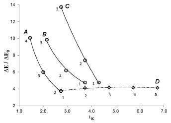 ![]() Figura 6. Correlación entre el cambio en la barrera de energía de reacción y el valor del Índice molecular de forma Kappa de orden 1 de las moléculas de reactivos. Las curvas A, B, C, D y los números sobre estas son para identificar cada una de las reacciones de la Tabla 1