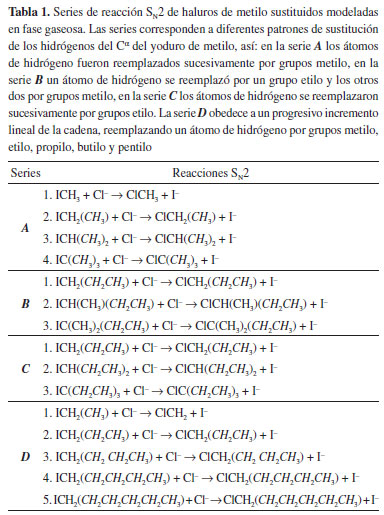 En este trabajo utilizamos como sistema modelo de reacción la sustitución nucleofílica en sistemas de haluro de metilo sustituidos, donde el grupo saliente es el yoduro y el grupo entrante es el cloruro. Como sustituyentes en el carbono metilénico utilizamos grupos metilo y etilo de la siguiente manera para construir las series de reacción que se muestran la Tabla 1: la serie A esta formada por reacciones donde el hidrógeno del carbono metilénico se ha reemplazado sucesivamente por grupos metilo, la serie B por reacciones donde se reemplazan los hidrógenos por grupos metilo y etilo, la serie C por reacciones donde los hidrógenos se reemplazan sucesivamente por grupos etilo. La serie de reactividad D la tomamos como referencia haciendo un alargamiento progresivo de la cadena por sustitución de un hidrógeno del centro de reacción por grupos metilo, etilo, propilo, butilo y pentilo.23