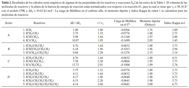 PARTE EXPERIMENTAL Barrera de energía de reacción Los métodos semi-empíricos de la química cuántica combinan información teórica y datos experimentales para calcular la estructura electrónica de las moléculas. Estos métodos aún son de utilidad en el estudio preliminar y con fines académicos de moléculas orgánicas sencillas dando resultados comparables a los métodos ab-initio y con poco tiempo de cómputo.24 La precaución que se debe tener al usar estos métodos es verificar que los átomos de las moléculas que interesa estudiar tengan funciones adecuadamente parametrizadas para uso en el cálculo, lo cual es cierto para la gran mayoría de moléculas orgánicas sencillas y de uso común. En este trabajo utilizamos el programa Spartan de Wavefunction Inc. para optimizar la geometría de las moléculas y para el cálculo de los perfiles de energía de los estados transitorios de las series de reacciones de la Tabla 1.25 Los cálculos se realizaron con tres métodos semi-empíricos: MNDO, AM1 y PM3, con el propósito de verificar la consistencia de los resultados.24 En estos tres métodos las aproximaciones en el cálculo no son tan severas ya que no desconocen del todo el solapamiento o traslape electrónico átomo-átomo y cuentan con datos experimentales más precisos para realizar la parametrización de ciertas funciones al momento de realizar el cálculo de los estados electrónicos. Con estos tres métodos semi-empíricos el tiempo de cómputo estuvo alrededor de los 2-3 minutos en un computador con procesador Intel-Core i3. Volumen molecular Para el cálculo del volumen de las moléculas con geometría optimizada se utilizó el modelo CPK (Corey-Pauling-Koltun) o modelo de esferas llenas de radio igual al radio de Van de Waals, donde la distancia entre los centros de las esferas es proporcional a la distancia internuclear.25 Índice Kappa Los índices Kappa o índices estéricos son algoritmos matemáticos que se aplican sobre una molécula con el propósito de cuantificar su geometría molecular o su forma. Estos algoritmos están diseñados a partir de concebir las moléculas como grafos donde los enlaces químicos representan la conectividad entre átomos. Para el cálculo de un índice Kappa de orden n, nκ, se deben contar en la molécula todos los posibles caminos o conexiones de longitud n que llevan de un átomo a otro, nP. Adicionalmente se deben calcular los caminos mínimo y máximo de orden n, nPmin y nPmax, que existan en moléculas hipotéticas con el mismo número de átomos que la molécula de interés. La mínima conexión de orden n se calcula en moléculas líneas y la máxima en moléculas con estructura cíclica (estrella) donde todos los átomos están conectados a uno central. En este trabajo utilizamos índices kappa de orden 1 para todas las moléculas de reactivos de la tabla 1, de acuerdo a la siguiente expresión: nκ=2 1Pmax 1Pmin /(1P)2 = N(N-1)2/(1P)2, donde N es el número de átomos en la molécula.26,27 Momento dipolar y carga de Mulliken Los métodos semi-empíricos también se utilizaron en Spartan para el cálculo del momento dipolar de la geometría optimizada de las moléculas y la carga de Mulliken del carbono alfa del centro de reacción. Los datos que mostraron mayor consistencia corresponden a los calculados con el método MDNO.25