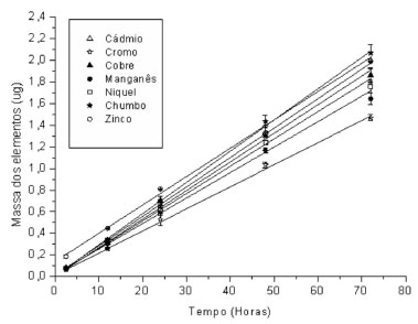 Esse fator de eluição, no caso do cromo e chumbo, indica a possibilidade de recuperar 90% do analito que foi retido na matriz e para o zinco 74%. O valor médio para a fase de ligação proposta neste trabalho foi de 0,84. Para a Chelex-100 o valor médio do fe, descrito na literatura, é de aproximadamente 0,80.10,11 Avaliação do dispositivo modificado segundo a primeira lei de difusão de Fick Assim como previsto pela primeira Lei de difusão de Fick10,11 e equação 4, os resutados apresentados na Figura 5 evidenciam um processo de acumulação linear dos elementos com o tempo de exposição para o dispositivo modificado com a fase difusiva proposta (AGE).