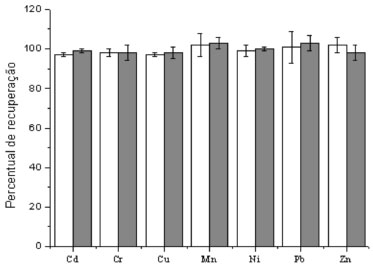 ![]() Figura 6. Resultados do estudo de recuperação das espécies em solução a 50 µg L-1, pH 6,0 ± 0,2 e NaNO3 0,01 mol L-1, com tempo de imersão de 6 h. Barras brancas indicam percentual de recuperação com o dispositivo modificado com MT-K10 e fase difusiva de AGE. Barras cinzas mostram a recuperação com o dispositivo modificado com MT-K10 e fase difusiva de HPA