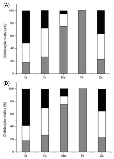 ![]() Figura 7. Distribuição das espécies metálicas na amostra de água do Rio Itajaí-Açu empregando dispositivos (A) modificados e (B) convencionais. Barras cinzas: fração particulada. Barras brancas: fração lábil. Barras pretas: fração complexada. Entre os elementos avaliados, niquel e cádmio não foram determinados, uma vez que suas concentrações ficaram abaixo do limite de detecção do ICP OES
