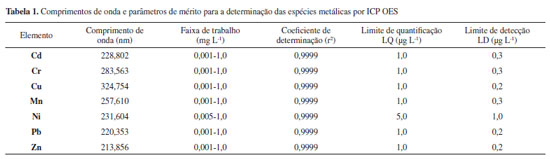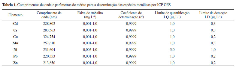 RESULTADOS E DISCUSSÃO Quantificação dos elementos traço Na Tabela 1 são apresentados os comprimentos de onda utilizados, a faixa de trabalho, os coeficientes de determinação (r2) e os parâmetros de méritos avaliados (LQ e LD). Observa-se que os coeficientes de determinação (r2) estão próximos de 0,9999, evidenciando que as curvas analíticas preparadas no ICP OES para os elementos em estudo apresentaram uma regressão linear satisfatória. Os limites de detecção e quantificação apresentados na Tabela 1 estão de acordo com o esperado para método.