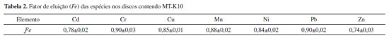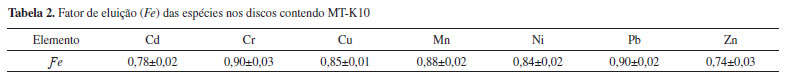 Avaliando os resultados apresentados na Figura 4 observa-se que não existem diferenças significativas no que se refere à sorção das espécies metálicas, que em média foi de 80%. Porém, resultados ligeiramente superiores foram obtidos para cobre, chumbo e cromo, sendo que para este último foi encontrado o maior percentual de sorção, aproximadamente 89%. Zhu et al.29 relataram grande afinidade da montmorilonita pelo cromo(III), de maneira semelhante a obtida nesse trabalho. A dessorção para os elementos Cr, Mn, Pb, Ni e Cu foi acima de 84%, em média, e para zinco e cádmio ficou em 74% e 78%, respectivamente. Em condições físico-químicas semelhantes, dos Anjos et al.25,30 obtiveram sorção na faixa de 78% a 97% e dessorção na faixa de 90% a 100% para os elementos estudados. Frois et al.23 obtiveram sorção de praticamente 100% para o cromo(III), com um percentual de recuperação de 89%. Portanto, os resultados obtidos neste trabalho são concordantes com aqueles descritos na literatura para a MT-K10. Embora os percentuais de dessorção para zinco e cádmio tenham ficado abaixo de 80%, isso não compromete o uso do material proposto como fase de ligação, visto que pode ser feita correção a partir do o uso do fator de eluição, que variou de 0,74 (Zn) a 0,90 (Cr e Pb), como mostrado na Tabela 2. O fator de eluição ou recuperação é usado para corrigir possíveis efeitos da eluição incompleta dos discos, principalmente em amostras reais, nas quais a concentração das espécies é desconhecida.