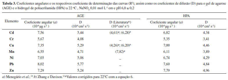 O coeficiente de determinação (r2) para as curvas variou de 0,995 (Zn2+) a 0,999 (Cr3+) Esse comportamento é semelhante aquele descrito quando se emprega a fase difusiva convencional (HPA).10,11 Portanto, os resultados são bastante satisfatórios e evidenciam que o dispositivo modificado com a fase de ligação empregando montmorilonita, juntamente com a fase difusiva alternativa à base de agarose, seguem a primeira lei de difusão de Fick, o que permite determinar o coeficiente de difusão (D) das espécies no gel de agarose, que pode ser comparado com o das espécies quando se emprega o hidrogel convencional, Tabela 3.