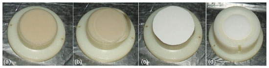 ![]() Figura 3. (a) suporte preenchido com o gel (montmorilonita imobilizada em agarose) na proporção de 12% argilomineral e 1,5% de agarose, tamanho aproximado de 11 cm × 10,5 cm. (b) discos obtidos no diâmetro de 2,5 cm e espessura de 1 mm