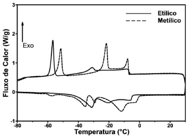 ![]() Figura 3. Curvas de DSC dos ésteres etílicos e metílicos do óleo de Syagrus romanzoffiana (jerivá)