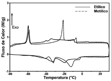 ![]() Figura 2. Curvas de DSC dos ésteres etílicos e metílicos do óleo de Butia capitata (butiá)