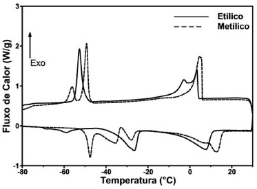 Na Tabela 3 observa-se as temperaturas de início de cristalização dos ésteres aqui estudados. As temperaturas de cristalização dos ésteres metílicos/etílicos derivados dos óleos de S. phalerata, B. capitata, S. romanzoffiana e T. cattapa foram -6,15 ºC/-6,86 ºC, -15,74 ºC/-16,61 ºC, -6,08 ºC/-8,33 ºC e 5,95 ºC/4,09 ºC, respectivamente. Os ésteres que apresentaram as menores temperaturas de cristalização foram os obtidos a partir dos óleos da família Arecaceae (S. phalerata, B. capitata, S. romanzoffiana), apresentando temperaturas negativas abaixo de -6,0 ºC, enquanto T. cattapa apresentou temperaturas positivas de início cristalização.