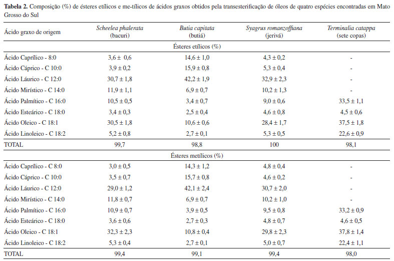 RESULTADOS E DISCUSSÃO Os teores de óleo de amêndoas das espécies, obtidos a partir da extração por Soxhlet foram os seguintes: 34,2% (S. phalerata), 23,0% (B. capitata), 19,2% (S. romanzoffiana) e 46,1% (T. cattapa). Após purificação, a fração lipídica foi submetida a reação de transesterificação usando KOH/metanol e KOH/etanol, resultando em misturas de ésteres com rendimentos que variaram de 75% até 93% (Tabela 1). A formação dos ésteres foi confirmada por espectros de RMN de 1H. O surgimento de singletos a δ 3,6 ppm, o que corresponde a grupos -OCH3 de ésteres, foi utilizado para avaliar o grau de pureza e a conversão em ésteres metílicos. Na reação de transesterificação com etanol, observou-se no espectro de RMN de 1H somente um quarteto em δ 4,01-4,415 ppm, dos prótons metilênicos da etoxila (-O-CH2-CH3), o que confirma a conversão em ésteres etílicos. Uma vez que o multipleto a δ 4,2-4,4 ppm, correspondente aos grupos de metileno da porção glicerol em trigliacilglicerídeos, desapareceu, pode-se observar a formação dos ésteres. Nas análises cromatográficas, foram identificados oito ésteres metílicos/etílicos de ácidos graxos obtidos das espécies S. phalerata, B. capitata, S. romanzoffiana (Arecaceae), e quatro ésteres foram identificados na mistura obtida pela transesterificação a partir do óleo T. cattapa (Combretaceae). A concentração de ésteres de todas as misturas obtidas ficou acima de 98,0%. A composição das misturas de ésteres é mostrada na Tabela 2.