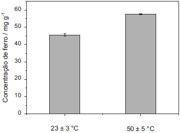 ![]() Figura 1. Otimização da temperatura de extração, temperatura ambiente (25 ± 3 ºC) e sob aquecimento (55 ± 5 ºC). Utilizando solvente extrator: HCl 12 mol L-1, Tempo de ultrassom: 30 min