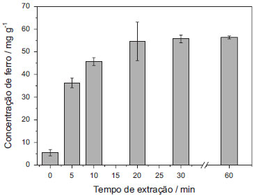 Os resultados obtidos demostraram que o aquecimento de 55 ± 5 ºC proporcionou uma eficiência maior na extração do ferro, uma vez que nestas condições foram obtidas concentrações superiores, se comparada à extração sem aquecimento (25 ± 3 ºC). A ação do ultrassom em temperatura de 50 ºC favorece a formação de núcleos de cavitação, o que por sua vez aumenta a eficiência de extração, conforme relatado na literatura.19 Assim, as demais otimizações foram realizadas com aquecimento a 55 ± 5 ºC para extração em ultrassom. O tempo de permanência no ultrassom para extração de ferro das amostras de solo foi avaliado e os resultados estão apresentados na Figura 2. Observou-se que a extração de ferro das amostras de solo não foi efetiva até 10 min de extração. Entretanto, a partir de 20 min não houve diferença significativa entre os resultados obtidos nos diferentes tempos de extração avaliados. O tempo selecionado para as demais otimizações foi de 30 min, uma vez que os valores de desvio padrão obtidos com 20 min de extração foram relativamente maiores.