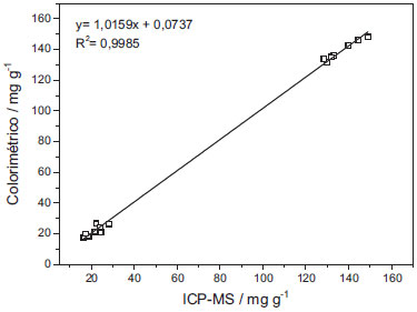 ![]() Figura 4. Relação entre os resultados obtidos por colorimetria usando extração assistida por ultrassom e os obtidos por ICP-MS usando digestão ácida assistida por micro-ondas