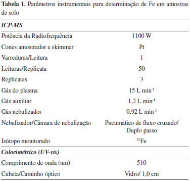 | Extração assistida por ultrassom para determinação colorimétrica de ferro em solo: uma comparação com espectrometria de massa com plasma indutivamente acoplado Ultrasound-assisted extraction for colorimetric determination of iron in soil: a comparison with inductively coupled plasma mass spectrometry |