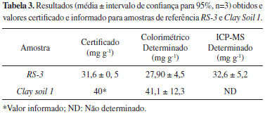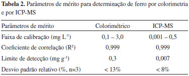 A verificação da exatidão foi realizada através de análise de amostras de referência com concentrações certificadas e informadas para ferro. Os resultados obtidos estão apresentados na Tabela 3, e demonstram boa concordância com o valor certificado (RS-3) e informado (Clay Soil 1) tanto para as determinações por colorimetria quanto por ICP-MS, de acordo com o teste-t, considerando um nível de confiança de 95%.