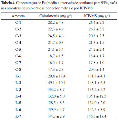 Parâmetros de mérito e verificação da exatidão Os parâmetros de mérito para determinação de Fe em amostras de solo foram obtidos para as determinações colorimétricas usando extração assistida por ultrassom e também por ICP-MS. Os coeficientes de correlação linear obtidos foram maiores que 0,999 para ambas as técnicas avaliadas e a precisão, expressa como desvio padrão relativo (RSD, n=3), foi menor que 13% para as análises colorimétricas e inferiores a 8% para as determinações por ICP-MS. Os limites de detecção (LOD) foram calculados considerando-se 3 vezes o desvio padrão de dez medidas consecutivas do branco das amostras dividido pelo valor da inclinação da respectiva curva de calibração. Os LODs dos métodos obtidos para as duas técnicas são apresentados na Tabela 2. Como esperado, os LODs obtidos para técnica de ICP-MS foram significantemente inferiores aos obtidos por colorimetria, contudo, o LOD de 0,3 mg g-1 obtido para as determinações colorimétricas são adequados para a determinação de Fe em amostras de solo, já que normalmente este elemento encontra-se em concentrações relativamente altas neste tipo de amostra. Os limites de quantificação (LOQ), definidos como 3,3 vezes o LOD, podem ser facilmente obtidos a partir dos dados da Tabela 2.