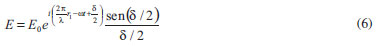 Como estamos considerando que L >> a, os vetores ![]() Logo, substituindo ![]() onde O campo total pode ser calculado pela soma dos campos de cada minionda, ou seja: ![]() O termo ![]() E o campo resultante é, ![]() n pode sempre ser tomado como um número muito grande já que as miniondas de Huygens são uma construção matemática e podem ser feitas tão próximas quanto se queira. Logo, o argumento do seno no numerador fica nδ/2(n - 1) ≈ nδ/2n = δ/2, ou seja, sen[nδ/2(n - 1)] ≈ sen(δ/2). Já no denominador, na condição de n grande, δ/2(n - 1) ≈ δ/2n é um ângulo muito pequeno e, portanto, sen[δ/2(n - 1)] ≈ δ/2n. Deste modo, ![]() onde ![]() Obtemos assim, o padrão de difração de uma fenda de largura a observado em um anteparo localizado a uma distância L >> a. Note que mesmo quando senθ (e, consequentemente, δ) é diferente de zero, a intensidade de luz I não se anula. Em outras palavras, a luz não está confinada na direção de propagação definida pela fenda, o que é a característica fundamental do fenômeno de difração. A figura de difração obtida quando uma fenda de largura a é iluminada por um feixe luminoso de comprimento de onda λ está ilustrada na Figura 2 (linha tracejada).