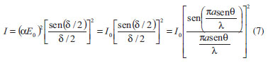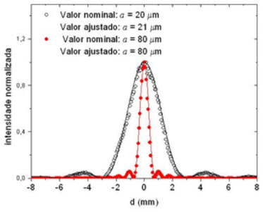 ![]() Figura 7. Padrões de difração medidos e calculados para fendas simples de larguras nominais a = 20 µm e a = 80 µm