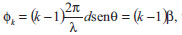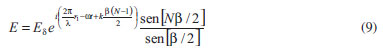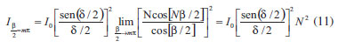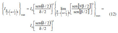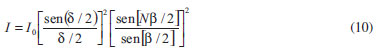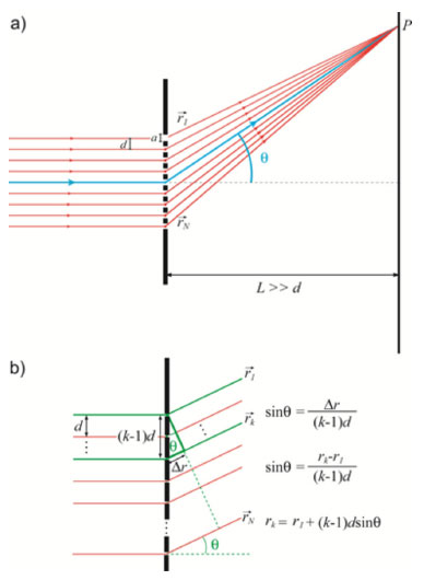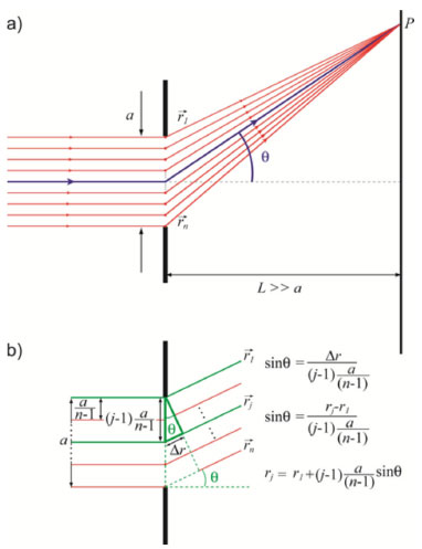 ![]() Figura 3. a) Diagrama esquemático de N raios partindo de fontes pontuas no centro das fendas