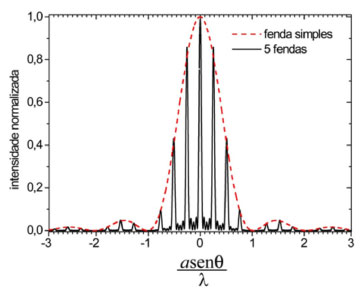 ![]() Figura 2. Padrão de difração de uma fenda simples de largura a e de 5 fendas com larguras a e separação entre fendas d = 4a