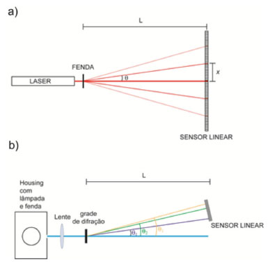 ![]() Figura 4. a) Esquema utilizado para detecção do padrão de difração usando um sensor linear. b) Montagem para espectroscopia com lâmpada