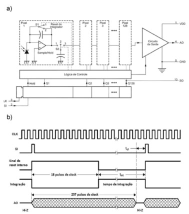 ![]() Figura 5. a) Diagrama funcional do TSL1402R. b) Sequencia de pulsos de controle necessarios para o funcionamento do PDA