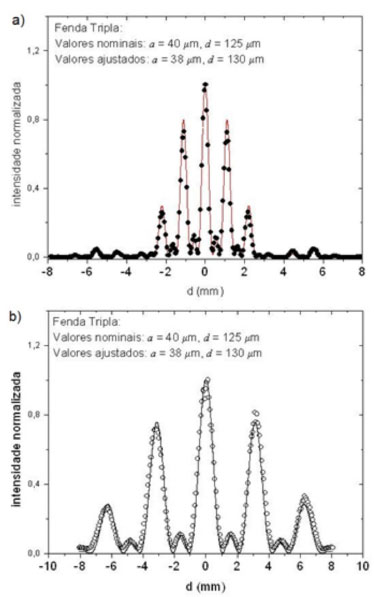 ![]() Figura 8. Padrões de difração medidos e calculados para fenda tripla de largura nominal a = 40 µm e separação entre fendas b = 125 µm