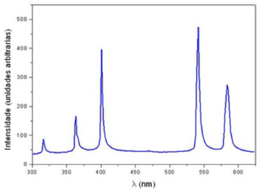 ![]() Figura 9. Espectro da luz emitida por uma lâmpada de Hg