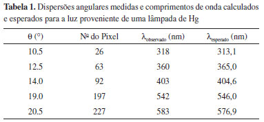 Em uma rede de difração, o número de fendas é da ordem de centenas ou milhares e o espaçamento entre fendas é muito pequeno. Como resultado, o padrão de difração se torna um conjunto de picos, cujas posições angulares são dadas por dsenθ = mλ (m = …, -2, -1, -0, 1, 2, …). Logo, a separação angular correspondente a diferentes ordens de difração será maior quanto menor for a separação entre as fendas da rede. Se luz policromática incide sobre uma rede de difração, cada comprimento de onda que a constitui aparecerá em uma posição angular distinta para mesma ordem de difração. Para demonstrar essas características, montou-se o aparato ilustrado na Figura 4b. O sensor foi posicionado de modo a permitir observar o padrão de primeira ordem da lâmpada de Hg na região de luz visível. Para calibrar a escala em nanômetros, os ângulos de difração de todas as linhas observadas foram medidos e os comprimentos de onda correspondentes foram calculados utilizando a condição de máximo de interferência dsenθ = λ. Os resultados estão apresentados na Tabela 1. Uma vez que a posição dos picos em termos do numero do pixel do sensor pode também ser medida, foi feita uma regressão linear, obtendo-se assim a função que relaciona o número do pixel no sensor e o comprimento de onda, a qual foi então utilizada para calibrar a escala da Figura 9. De fato, para fins de demonstração, a calibração foi feita manualmente, porém o software desenvolvido realiza essa conversão automaticamente a partir da associação entre o número do pixel e o comprimento de onda correspondente. Note que a linha observada na Figura 9 não tem o típico perfil lorentziano, o que se deve principalmente a aberrações devido à lente de focalização.