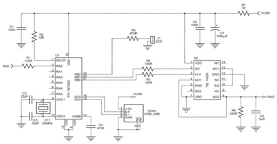Como mostrado na Figura 6, o microcontrolador e o PDA são alimentados diretamente pela porta USB. Os pinos RB0 e RB1 do microcontrolador são responsáveis por gerarem os sinais de "Clock" (CLK) e o sinal de "Serial Input" (SI). O pino RB2 está conectado a um LED e tem por finalidade sinalizar quando a coleta de dados está sendo realizada. As saídas de sinal do PDA (AO1,AO2) estão interligadas e conectadas a um filtro RC e em seguida a um conversor analógico digital de 12 bits do microcontrolador (RA0).11 O firmware embarcado no microcontrolador foi codificado em linguagem C e está descrito em detalhes no material suplementar. O software residente no microcomputador foi escrito em Delphi utilizando os pacotes Jedi (JvHIDDeviceController para comunicação com a porta USB) e SDL (Software Development Lohninger para a construção da parte gráfica).12 O programa de aquisição desenvolvido apresenta uma área para graficar os dados coletados, uma barra de ferramentas para manipulação gráfica dos resultados e uma barra de botões com as opções de leitura do sensor e manipulação de arquivos. Os botões que controlam a leitura do sensor oferecem três modos de operação que são: "Simples", "Contínua" e "Médias". Há ainda um botão para interromper a execução das medidas, um campo para definir o tempo de integração, um campo para definir o numero de médias e botões para salvar, abrir e limpar o gráfico. Existe também uma funcionalidade que permite subtrair do resultado coletado um resultado de fundo previamente armazenado no microcomputador. Os dados são exibidos graficamente, mostrando como abscissa o numero do pixel no detector e como ordenada a intensidade integrada pelo referido pixel. Há ainda uma opção para calibrar a escala, na qual o usuário especifica uma nova escala para a abscissa (por exemplo, em milímetros).