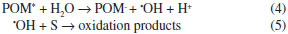 The increment of the catalytic activity when the TPA content increases is principally due to the direct participation of TPA in the degradation of the organic substrate (reactions 1-3) and/or in the production of the OH reactive species (reaction 4) that participates in the degradation of the organic substrate (reaction 5).53 ![]() For comparison purposes, we measured the catalytic activity of the bulk (NH4)3PW12O40 salt under the same experimental conditions. In this test, the amount of (NH4)3PW12O40 was fixed in order to obtain a TPA amount similar to that contained in the NH4ZSM5TPA30 sample. MO concentration decreased by 32% at 240 min under reaction and it was lower than those obtained using the NH4ZSM5TPA30 sample. We also measured the catalytic activity of TPA supported (30% w/w in the final solid) on γ-Al2O3 (surface area, 280 m2 /g; mean pore diameter 3.4 nm).32 After 240 min under reaction the MO concentration decreased only 25 %. This could be attributed to the fact that only the [P2W21O71]6- anion was present in this TPA supported on γ-Al2O3.32 This is in agreement with the fact that at similar TPA content, the sample with lower amount of [P2W21O71]6- anion showed the higher catalytic activity.30 Taking into account the result published by Mizrahi et al.,54 the rather poor catalytic behavior of the (NH4)3PW12O40 salt could be mainly due to the lower specific surface area of ammonium salt (125 m2 g-1) in comparison to NH4ZSM5TPA30 sample (323 m2 g-1). However, the (NH4)3PW12O40 salt showed a higher surface area than TPA, due to the smaller sizes of the primary particles (composed by certain number of [PW12O40]3- and NH4+ cations) and their three-dimensional arrangement.32 Additionally, we can suggest that the shape and the size of the (NH4)3[PW12O40] crystals should be considered in order to explain the catalytic behaviour of the samples. On the other hand, we consider that NH4ZSM5 zeolite mainly acts as a suitable support to disperse and fix the TPA. However, we are not able to rule out that the specific photophysical properties ascribed to Y-zeolite such as the control of charge-transfer and electron-transfer processes15,16 could take place in our samples and enhance the catalytic activy in a certain degree. The catalyst with the best performance in MO degradation (NH4ZSM5TPA30) was chosen for further studies. In order to study TPA leaching, we followed the percentage of MO degraded (CDEG) using NH4ZSM5TPA30 as catalyst during 60 min. After that, the catalyst was removed by filtration and the solution was irradiated another 180 min. The CMO/CºMO values obtained during the first 60 min of irradiation were similar to those shown in Figure 7, and the CDEG value equal to 38% was reached at 60 min. However, the percentage of MO degraded remained constant during the irradiation for 180 min after the catalyst removal. According to these results we can rule out that significant TPA solubilization takes place during the reaction. The effect of catalyst concentration (CCAT) on the degradation rate was studied by varying catalyst concentration from 0.25 to 1.00 g L-1 keeping MO concentration constant. It was found that the amount of MO degraded after 240 min (CDEG) increased significantly from 33% to 81% when Ccat was raised from 0.25 to 0.50 g L-1. CDEG slightly increased when CCAT was equal to 0.75 g L-1 (90%) and it decreased (70%) for higher catalyst concentrations (CCAT = 1.0 g L-1). At CCAT values higher than 0.50 g L-1,55,56 the solution became cloudy, light penetration was reduced and as a result the CDEG/CCAT ratio decreased. Additionally, the CCAT increment may result in the agglomeration of catalyst particles, hence part of the catalyst surface became unavailable for photon absorption and the degradation rate subsequently decreased. The solution pH is an important variable in aqueous phase mediated photocatalytic reactions because it influences the catalyst surface charge, the adsorption of the substrate, and other physicochemical properties of the system57 In order to study the effect of pH on the photocatalytic degradation of methyl orange by NH4ZSM5TPA30, the experiments were performed at acidic (pH=2.5) and alkaline (pH=9.7) pH values of the MO solution, keeping all other experimental conditions constant. The amount of MO degraded slightly increased at pH= 2.5 (from 81% to 91%) at the same irradiation time (240 min) and it dramatically decreased (from 81% to 32%) at pH=9.7. A similar influence of the pH on the photodegradation of methyl orange was reported18,21,22 in other reaction systems. The higher MO amount degraded at acidic pH is due to the increment of the MO adsorbed on the catalyst surface (CMOADS). The CMOADS values increased from 3.2 10-6 mol g-1 to 8.2 10-6 mol g-1 when the pH decreased from 5.0 to 2.5. On the other hand, CMOADS decreased from 3.2 10-6 mol g-1 to 1.2 10-6 mol g-1 when the pH increased from 5.0 to 9.7. These results are in agreement with the fact that at pH values lower or higher than pHzpc, the catalyst surface will be positively or negatively charged, and as a result the absorption of negatively charged MO will be favored or impeded, respectively. The use of TPA immobilized on NH4ZSM5 zeolite allows an easy separation and recovery of the catalyst for its immediate reutilization. After each reaction, it was recovered by filtration, washed with distilled water and dried at ambient temperature. The catalyst was reused three times. The percentage of MO degraded (CDEG) during the first and the second reuses (65% and 40%, respectively) was significantly lower than the value obtained using the fresh catalyst (90%). The CDEG value reached after the third reuse was practically the same (39%). Taking into account that significant TPA solubilization did not take place during the reaction, the activity loss of the catalyst could be due to the adsorption of degradation products on the catalyst surface.58 The elimination of degradation products can be 