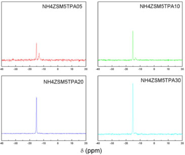 ![]() Figure 1. 31P MAS-NMR spectra of NH4ZSM5TPA05, NH4ZSM5TPA10, NH4ZSM5TPA20, and NH4ZSM5TPA30 samples