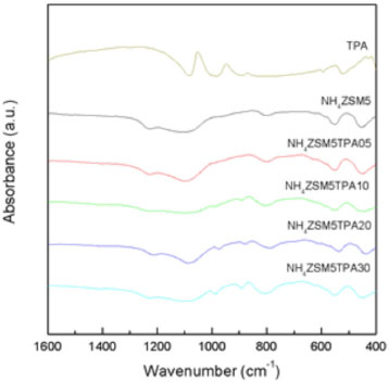 ![]() Figure 2. FT-IR spectra of TPA, (NH4)3PW12O40, NH4ZSM5, NH4ZSM5TPA05, NH4ZSM5TPA10, NH4ZSM5TPA20, and NH4ZSM5TPA30 samples
