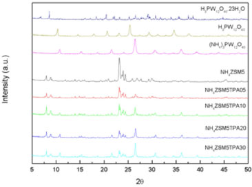 ![]() Figure 3. XRD patterns of H3PW12O40 ·23H2O (JCPDS 50-0655), H3PW12O40 (JCPDS 50-0657), (NH4)3[PW12O40] (JCPDS 50-0305), NH4ZSM5 (JCPDS 44-0002), and the samples NH4ZSM5TPA05, NH4ZSM5TPA10, NH4ZSM5TPA20 and NH4ZSM5TPA30