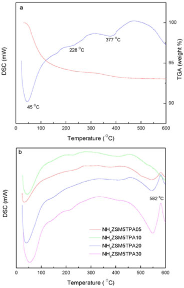 ![]() Figure 4. Thermal analysis diagrams of NH4ZSM5 zeolite (a) and NH4ZSM5TPA05, NH4ZSM5TPA10, NH4ZSM5TPA20, and NH4ZSM5TPA30 samples (b)