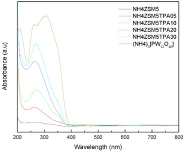 ![]() Figure 5. UV-Vis-DRS spectra of the samples NH4ZSM5, NH4ZSM5TPA05, NH4ZSM5TPA10, NH4ZSM5TPA20, NH4ZSM5TPA30 and (NH4)3[PW12O40]