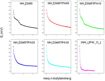 ![]() Figure 6. Potentiometric titration curves of the NH4ZSM5, NH4ZSM5TPA05, NH4ZSM5TPA10, NH4ZSM5TPA20, and NH4ZSM5TPA30, and (NH4)3[PW12O40]