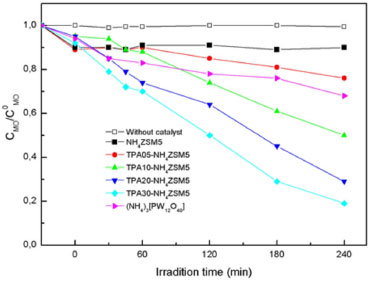 ![]() Figure 7. Photocatalytic degradation of MO as a function of the irradiation time using NH4ZSM5, NH4ZSM5TPA05, NH4ZSM5TPA10, NH4ZSM5TPA20, NH4ZSM5TPA30, and (NH4)3[PW12O40] as catalyst