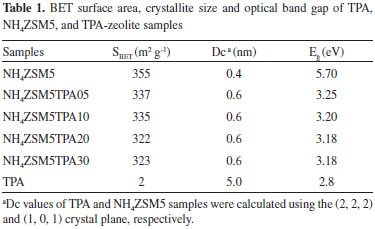 RESULTS AND DISCUSSION Physicochemical characterization In Table 1 the BET surface area (SBET) of the synthesized materials together with NH4ZSM5 and TPA samples, determined from N2 adsorption-desorption isotherms (data not shown) using the Brunauer-Emmett-Teller (BET) method, are shown.