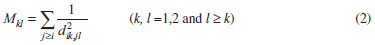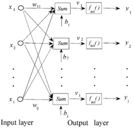 Root mean square relative error (RMSRE) was used to indicate the prediction performance of the developed models. The RMSRE is defined as Equation 1: ![]() where REi is the relative error of the ith sample; n is the number of samples; Tb,pred and Tb,obs is the predicted Tb and observed Tb respectively. MDEV index For calculating the MDEV index of a molecule, the whole molecule is regarded as a topological graph. Each non-hydrogen atom is considered as a point and each chemical bond is considered as an edge. The relative electronegative of each chlorine atom and benzene ring is defined as 1. Correspondingly, the MDEV index is defined as Equation 2: ![]() In Equation 2, k or l is the type of atoms (k =1 or l =1 denotes the chlorine atom, and k =2 or l =2 denotes the benzene ring); Items i and j are the coding number of a chlorine atom or a benzene ring. Additionally, i and j belong to the kth and lth type respectively. The dik,jl represents the nearest relative distance between the ith and jth atom. For example, di1,j1 indicates the shortest relative distance between the ith and jth chlorine atom. The relative distance between the two adjacent non-hydrogen atoms is defined as d = 1. According to Equation 2, there are three elements, M11, M12 and M22, in the MDEV index for a PCDD/F molecule. For instance, the MDEV index of 2, 3, 7-CDD should be calculated as follows: ![]() The MDEV index of 2, 4, 6-CDF should be calculated as following: ![]() Artificial neural network ANN14-17,19-29 is a multivariate calibration approach capable of modeling various complex functions. Its basic processing unit is the neuron (node). An ANN comprises a number of neurons organized in different layers. Linear artificial neural network,25-29 is a kind of neural network having no hidden layers, but an output layer with fully linear neurons (that is, linear neurons with linear activation function). It is the simplest ANN and is usually used to develop linear model. It is often used as a good benchmark against which to compare the prediction performance of other methods. Although a number of multivariable calibration problems cannot be solved or solved well by L-ANN, many others can. It is common to find that a problem which was perceived to be difficult and non-linear can actually be solved satisfactorily by using L-ANN. In L-ANN, the neurons between the input and output layers fully connected, while the neurons in the same layer do not. Figure 1 shows the basic architecture of the L-ANN.