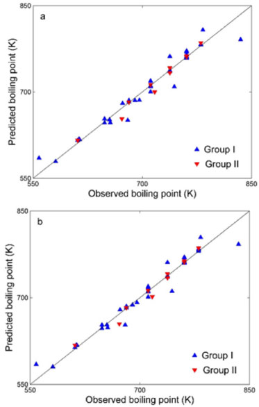 MLR model Generally, a simple model should always be chosen in preference to a complex model, if the latter does not fit the data better. Thus, we firstly investigated whether MLR is feasible to model the quantitative relationship between the MDEV index and Tb of PCDD/Fs. The MDEV index was used as the independent variable and the Tb was used as the dependent variable to develop the regression model. In order to assess the predictive ability of the developed model, two validation methods, leave-one-out cross validation and external validation, were conducted. The 52 samples shown in Table 1 were randomly split into two groups: Group I, which comprises 42 samples, and Group II, which comprises 10 samples. Leave-one-out cross validation was applied to Group I. The result is presented in Table 2. As shown in Table 2, the predicted Tb is in consistent with the observed Tb. For the 42 compounds, the RMSRE of prediction is 1.77. Moreover, the predicted Tb were plotted versus the observed Tb (as shown in Figure 2a) and the plot shows a linear relationship (y = 0.9904 x + 7.9881 with R = 0.9819) between the predicted and observed Tb. Subsequently, external validation was carried out to further assess the predictive ability of the MLR model. In this procedure, the model was established by using all the 42 compounds in Group I as the calibration set. The obtained regression equation is: Tb = -60.50 M11 + 35.78 M12 - 2.14 M22 + 580.20. The R2, Standard error of the estimate (S.E.) and F value of the regression model is 0.9672, 10.426 and 368.8 respectively. The value of F [F < F0.01 (N, N-3)] indicates that MDEV index is significant to Tb. It is reasonable to develop a regression model between the MDEV index and Tb. The S.E. is significantly smaller than the sample mean of Tb. It is shown that the obtained regression equation fits the data well. Then, the Tb of the samples in Group II was predicted by using the obtained regression equation. The prediction result is shown in Table2. As shown in the table, the predicted Tb is in good accordance with the observed Tb. For the 10 compounds, the prediction RMSRE is 1.23. The plot of predicted Tb versus observed Tb is shown in Figure 2a, which shows a linear relationship (y = 0.9957 x + 0.9347 with R = 0.9864) between the predicted and observed Tb.