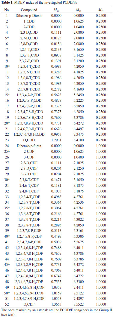 RESULTS AND DISCUSSION The MDEV index of PCDD/Fs was calculated. The result is listed in Table 1 and Table 3. Clearly, the MDEV index of different PCDD/F molecules is quite different. It is demonstrated that MDEV index can describe the structural differences among these compounds. It is reasonable to use the MDEV index as the structural descriptor to develop the QSPR model of PCDD/Fs.