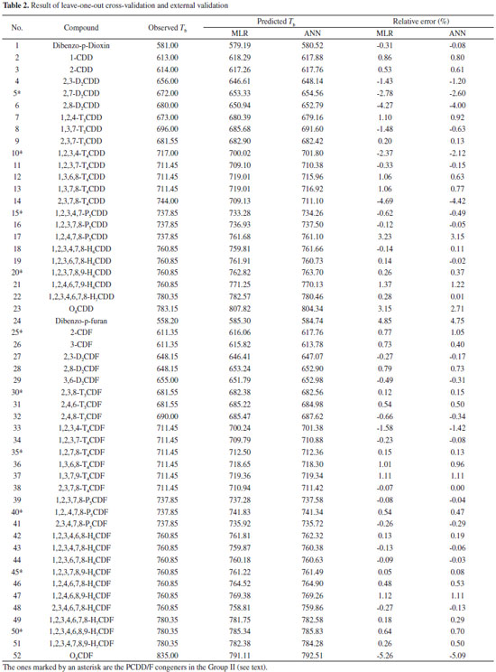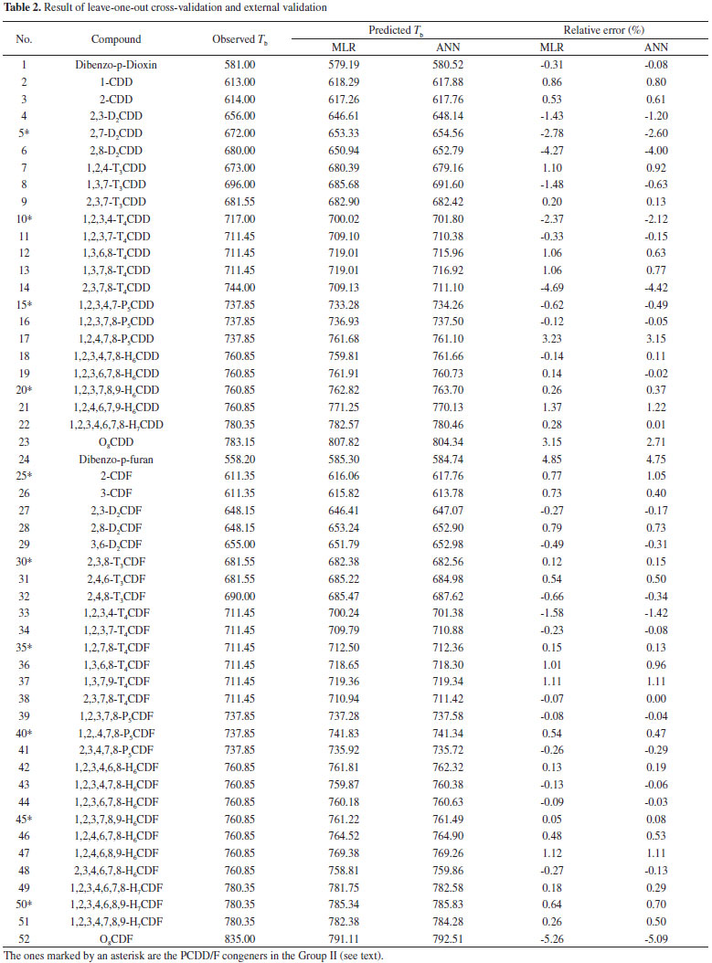 ICollege of Chemistry and Chemical Engineering, Xi'an Shiyou University, Xi'an 710065, China Recebido em 17/10/2014 *e-mail: mop@xsyu.edu.cn The quantitative structure property relationship (QSPR) for the boiling point (Tb) of polychlorinated dibenzo-p-dioxins and polychlorinated dibenzofurans (PCDD/Fs) was investigated. The molecular distance-edge vector (MDEV) index was used as the structural descriptor. The quantitative relationship between the MDEV index and Tb was modeled by using multivariate linear regression (MLR) and artificial neural network (ANN), respectively. Leave-one-out cross validation and external validation were carried out to assess the prediction performance of the models developed. For the MLR method, the prediction root mean square relative error (RMSRE) of leave-one-out cross validation and external validation was 1.77 and 1.23, respectively. For the ANN method, the prediction RMSRE of leave-one-out cross validation and external validation was 1.65 and 1.16, respectively. A quantitative relationship between the MDEV index and Tb of PCDD/Fs was demonstrated. Both MLR and ANN are practicable for modeling this relationship. The MLR model and ANN model developed can be used to predict the Tb of PCDD/Fs. Thus, the Tb of each PCDD/F was predicted by the developed models. INTRODUCTION Polychlorinated dibenzo-p-dioxins and polychlorinated dibenzofurans (PCDD/Fs) are two series of persistent organic pollutants which have been detected in almost all compartments of the global ecosystem. These chemicals have gained much attention due to their toxicity, environmental persistence, tendency to accumulate through the food chain, and the risk to human health. PCDD/Fs are not produced intentionally and do not serve any useful purpose. They are formed as byproducts of many industrial and combustion processes. PCDD/Fs are semi-volatile compounds. After released into the atmosphere, they are likely to transfer to other environmental compartments such as soil, water, sediments and their resident biota where they can last for years before degradation.1-5 The boiling point (Tb) is an important property for studying the volatility of PCDD/Fs, which is correlated with the fate, transport, and transformation of PCDD/Fs in the environment. Boiling point is also a significant factor in determining physico-chemical properties of PCDD/Fs, such as vapor pressure, octanol/water partitioning coefficient and aqueous solubility.6-9 A quantitative study on the Tb is necessary to understand the environmental behavior of PCDD/Fs. Experimentally determining the Tb of PCDD/Fs is still a hard work because of the complexity of analytical methods, high cost of experiments and lack of the standards.7 In addition, the measurement of boiling point of PCDD/Fs is hazardous due to the high vapor pressures involved.6 Up to now, the Tb has not been experimentally determined for each PCDD/F congener. Quantitative structure property relationship (QSPR) method is safe, fast, convenient and cost-effective for predicting the property of compounds. Therefore, it is worthwhile to develop an accurate and easy-to-use QSPR model for predicting the Tb of PCDD/Fs. Topological index is a kind of structural descriptor which is often used in QSPR researches. It can efficiently describe the structure of a molecule without detailed molecular orbital calculations. It is useful because, despite its mathematical simplicity, topological index is able to differentiate molecules with different structures.10,11 The aim of this work is developing the QSPR model for the Tb of PCDD/Fs based on the topological index. Molecular distance-edge vector (MDEV) index12-17 was used as the structural descriptor of PCDD/Fs. Multivariate linear regression (MLR) and linear artificial neural network (L-ANN) were employed to model the quantitative relationship between the Tb and MDEV index of PCDD/Fs.